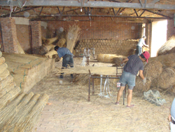Unter dem Reetballen packen wir PKW-Reifen und eine Seite unsere Hallen ist immer offen so dass