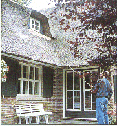 ein Reetdach einer Behandlung mit Magma Feuerstop SG2 unterzogen wird, unterstützt das jedoch